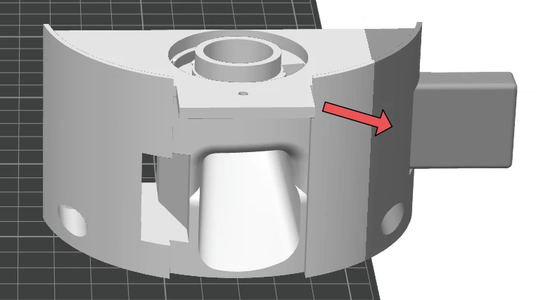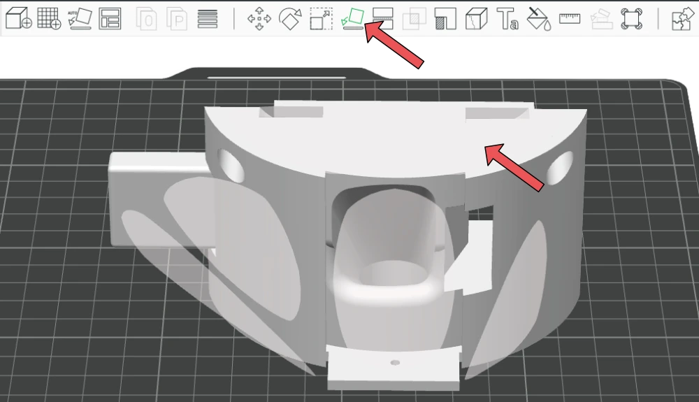 Damit das Bauteil sicher und gerade auf einer definierten Fläche liegt, ist es ratsam, das Bauteil nach dem manuellen Drehen mit dem Werkzeug „Auf Fläche legen [F]“ auf die gewünschte Seite des Druckbetts zu platzieren. Dazu bewegt ihr die Maus über die angezeigte Fläche und wählt die Fläche aus, die auf dem Druckbett aufliegen soll.
