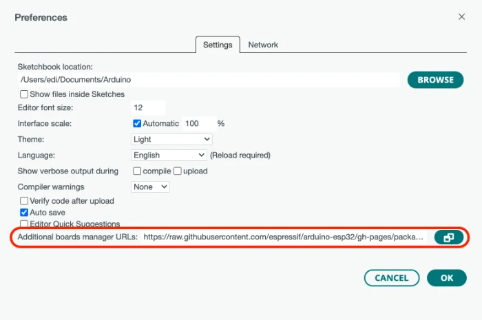 Es öffnet sich ein weiteres Fenster, und hier könnt ihr jetzt das ESP32 Board mit einem json link hinzufügen.