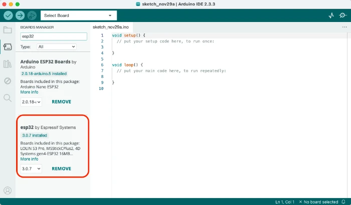 Unter dem Menü Werkzeuge > Board >Boardverwalter oder mit dem Board Verwalter ICON, suchen wir nach ESP32 im Suchfeld, und installieren die aktuelle Board-Version von Espressif Systems (3.0.7). Nach einer erfolgreichen Installation empfiehlt es sich, die Arduino IDE neu zu starten.
