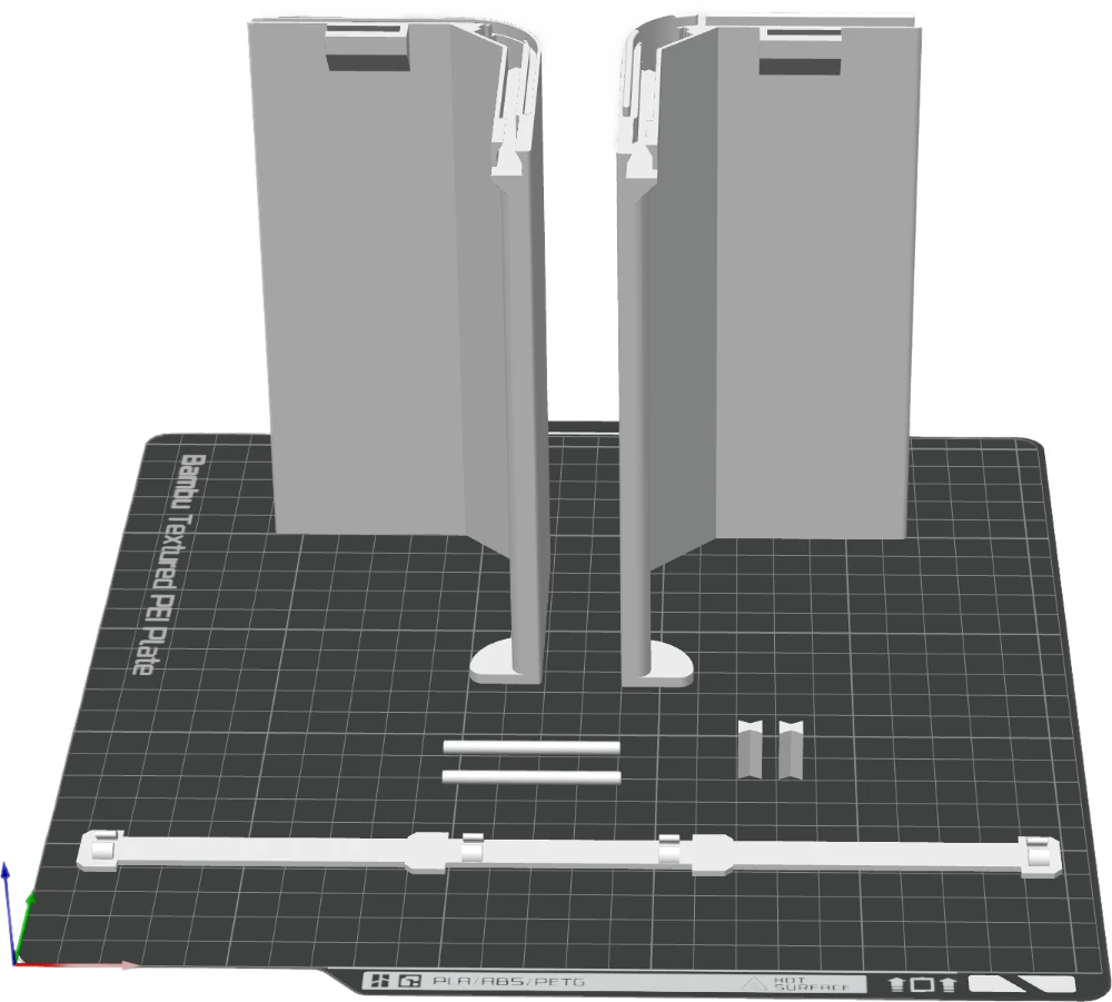 Das Dovetail Joint sollte hochkant ausgerichtet werden, während beim LED Holder die Laschen nach oben zeigen müssen. Die beiden Connecting Rods sind mit der abgeflachten Seite auf dem Druckbett zu platzieren.